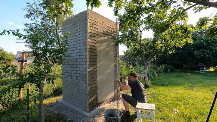 И постройте теперь стены ввысь по тому же принципу, что и резервуар, и основание душа: листы пеноплекс + сетка + клей.