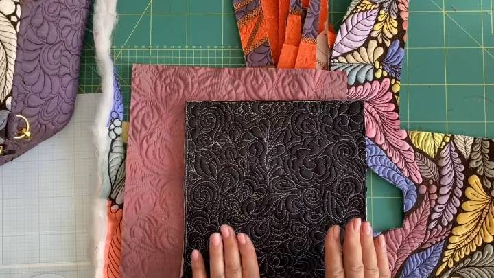 Арт-полотно может быть собрано из маленьких кусочков, которые соединены вместе свободно-ходовой стежкой, фантазийной, например, цветами.