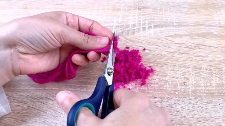 Кисточку промыть и просушить. Пряжу желаемого цвета нарезать на маленькие кусочки.