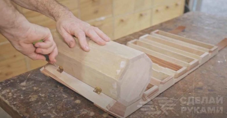 На следующем этапе изготавливаем восемь отделений ящика. Боковые стороны ящичков обрезаем на циркулярной пиле, чтобы они получились скошенными.