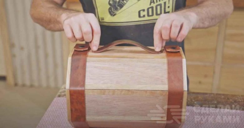 На последнем этапе останется только обработать дерево минеральным маслом и сделать ручку. Для изготовления ручки автор тоже использует кусок кожи.