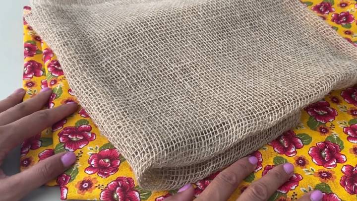Вырежьте из красивой ткани 2 квадрата со сторонами 30 см. Также вырежьте такие же квадраты из тонкого поролона (можно заменить другим похожим материалом). Начертить на бумаге квадрат со сторонами 6 см, приложить к левому и правому нижнему углам поролона, вырезать. Приложить поролон к мешковине.