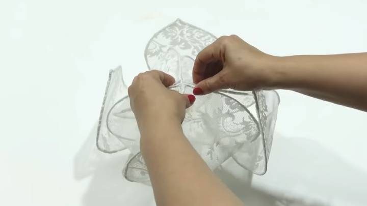 В конце тюль закрепите так, чтобы два конца соединились. Можно и нужно использовать клей. Затем раздвиньте сердцевину так, чтобы сформировался лист. Повторите со всеми заготовками. Добавьте на одну сторону клей, приложите к тюлю, обрежьте ненужную ткань.