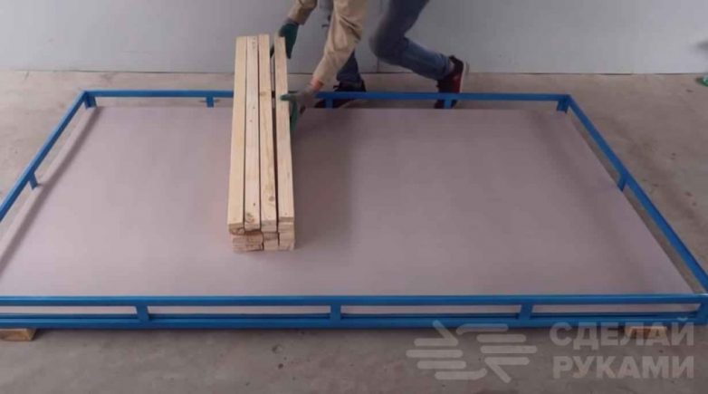 К основанию каркаса кровати прикручиваем лист фанеры (под ним обязательно должны быть ребра жесткости). К фанере крепятся деревянные рейки. Таким образом у нас получится решетчатое дно для матраса.