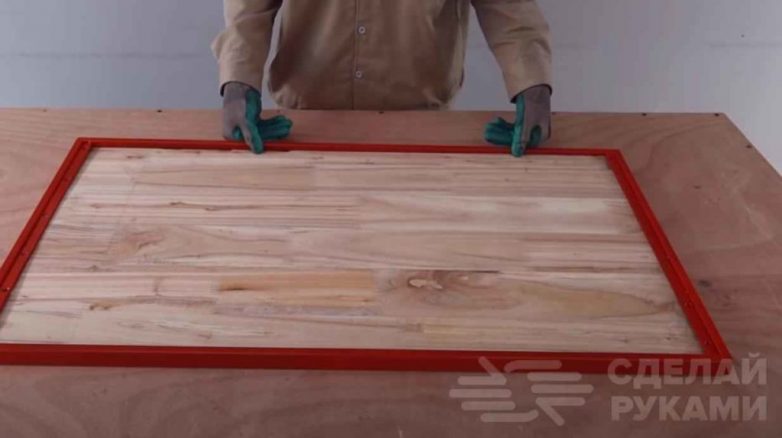 Столешницу можно сделать из мебельного щита или досок. По бокам столика крепятся складные механизмы, с помощью которых стол будет складываться и раскладываться.