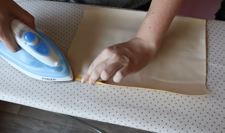 Заготовки для ручек сложите пополам лицевой стороной наружу, прогладьте, а затем каждую из половинок еще раз загладьте внутрь, формируя четырехслойную ручку.