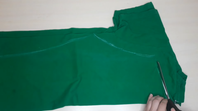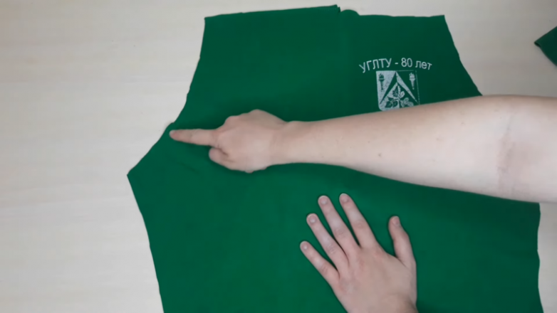 Футболку сложите пополам таким образом, чтобы одна сторона располагалась немного ниже второй. Подходящие по размеру шорты, брюки или бриджи также сложите пополам, наложите на ткань и обведите, оставляя припуск на швы 1,5-2 см.
