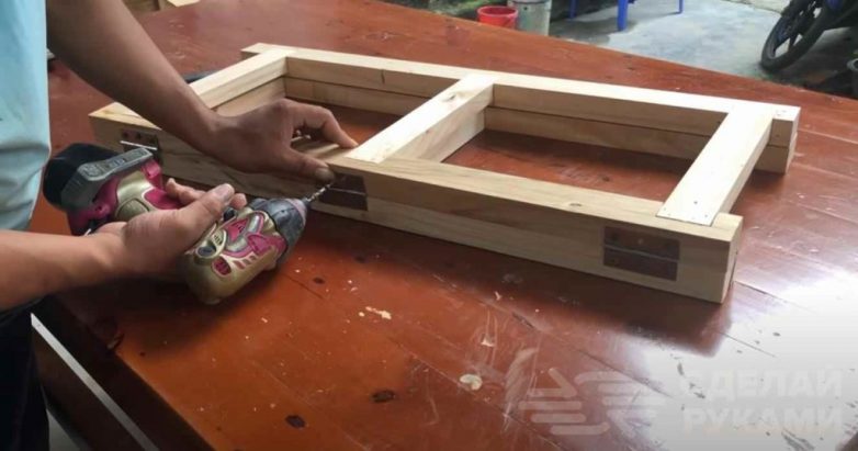 Из деревянных брусков собираем две прямоугольные рамки нужного размера, и соединяем их вместе с помощью мебельных петель.