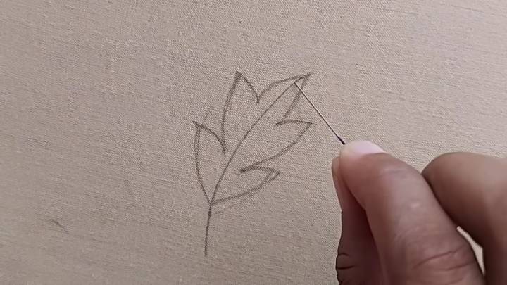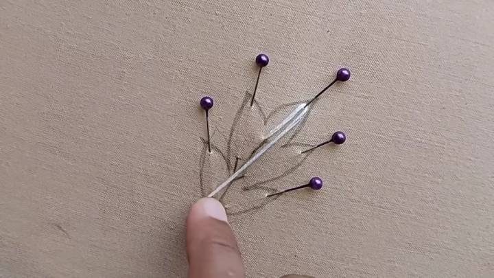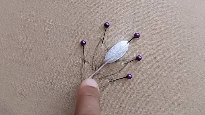 На ткани нарисуйте самый простой листок. В каждой части листа приколите булавку, как показано на фото ниже. Чёрными нитками вышейте стебелёк.