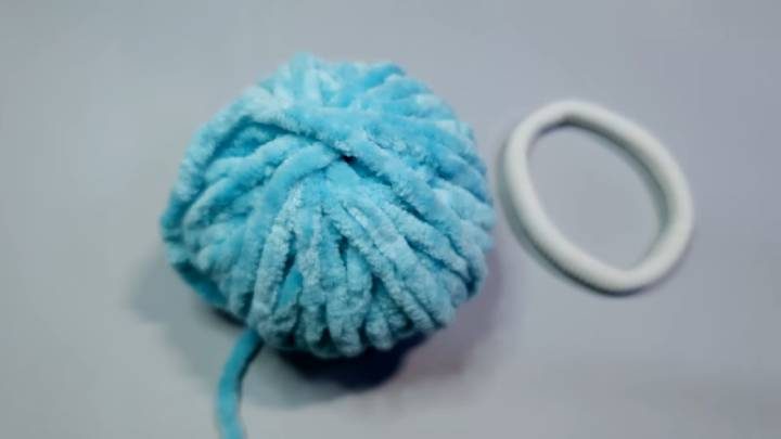 Прикрепите плюшевую пряжу к резинке и обвяжите по всей длине столбиками без накида (СБН). Кол-во столбиков может быть любым, в зависимости от размеров резинки. В данном МК у мастерицы получилось 24 столбика.