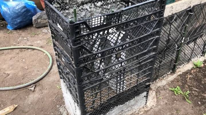 У пластиковых ящиков обрежьте стенки, оставив только одну. Скрепите их вместе хомутами (стяжками). Ещё у нескольких ящиков обрежьте дно, а не стенки. Дно закрепите вторым рядом стяжками.