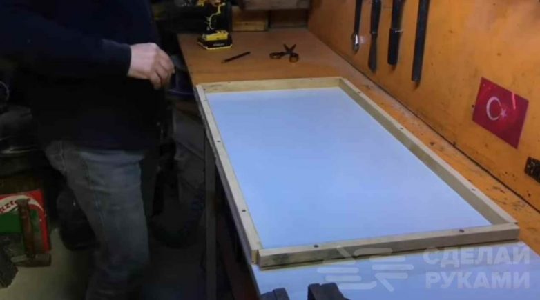 Берем лист ламинированного ДСП, обклеиваем его пленкой или скотчем. По периметру прибиваем деревянные брусочки подходящей высоты.