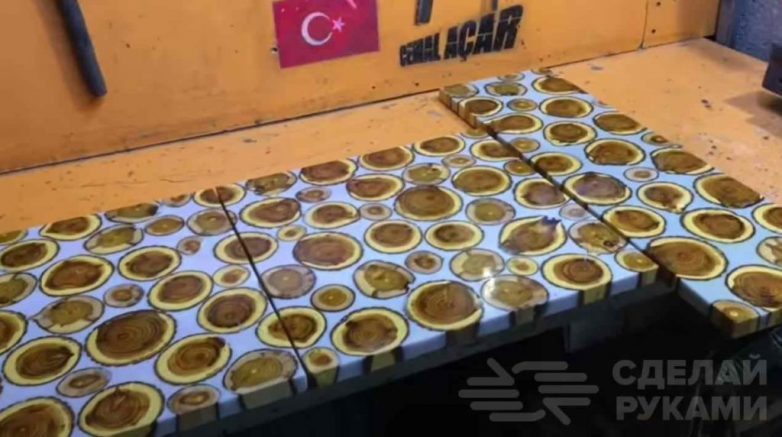 Укладываем спилы в форму, после чего заливаем полиэфирной или эпоксидной смолой (эпоксидка прочнее, но времени на ее затвердевание требуется больше).