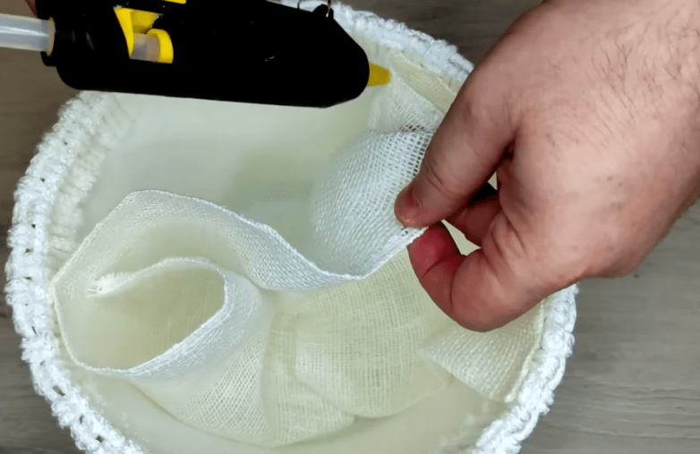 С одной стороны делаем подгиб по всей ширине подкладки, дополнительно фиксируя ткань при помощи клеевого пистолета. Приклеиваем подкладку к внутренней части корзинки, а затем расправляем.
