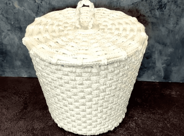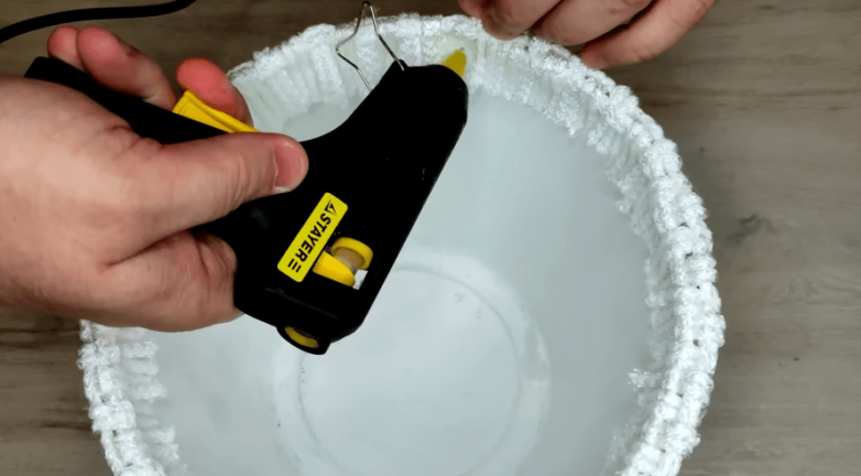 Последний ряд оплетки делаем с переходом через кромку, практически по внутренней стороне ведра с дополнительной проклейкой. Обрезаем излишки шнура с небольшим запасом и приклеиваем их к стенкам для лучшей фиксации.