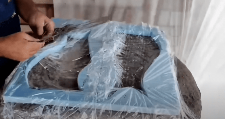 Затем подготавливаем рабочий раствор из 2 частей песка и 1 части цемента. Предварительно застелив рабочую поверхность, а также дно формы полиэтиленом, заполняем форму рабочим раствором в несколько слоев, между которыми прокладываем металлическую решетку или проволоку — она армирует будущую фигурку.