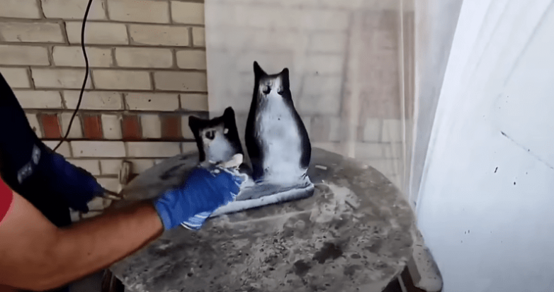 На месте глаз будущей кошки можно просто сделать отверстия, для этой цели отлично подойдут небольшие отрезки трубы подходящего диаметра: их просто вставляем на месте глаз. Оставляем цемент подсыхать примерно на 2 часа, после чего по подсохшей, но все еще податливой поверхности дорисовываем необходимые детали.