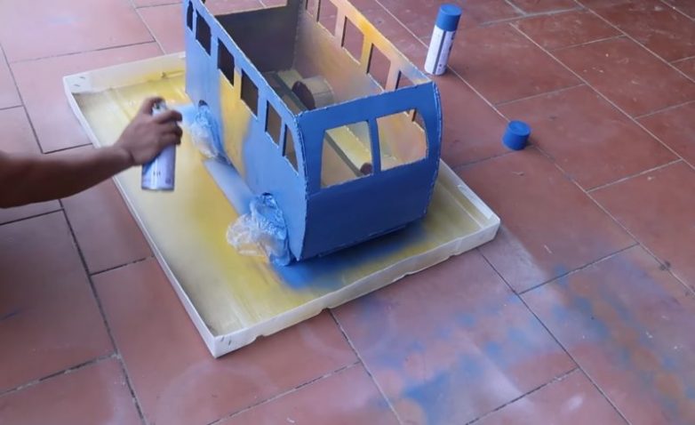Из плотного многослойного картона вырежьте две боковые части автобуса, заднюю и переднюю часть. Сделайте вырезы под колеса, двери и окошки.