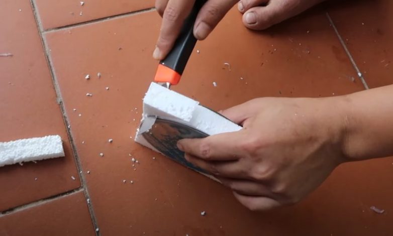 Для изготовления колес используйте старые CD диски и пенопласт. Приклейте диски к пенопласту с двух сторон и обрежьте лишнее, чтобы получить круглое колесо.
