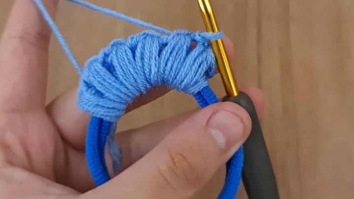 Сделайте первую петлю на пряже крючком. Теперь сделайте 18 накидов вокруг резинки. Здесь удобно вязать тунисским крючком — он немного длиннее обычного. Но и обычным крючком тоже всё получится.