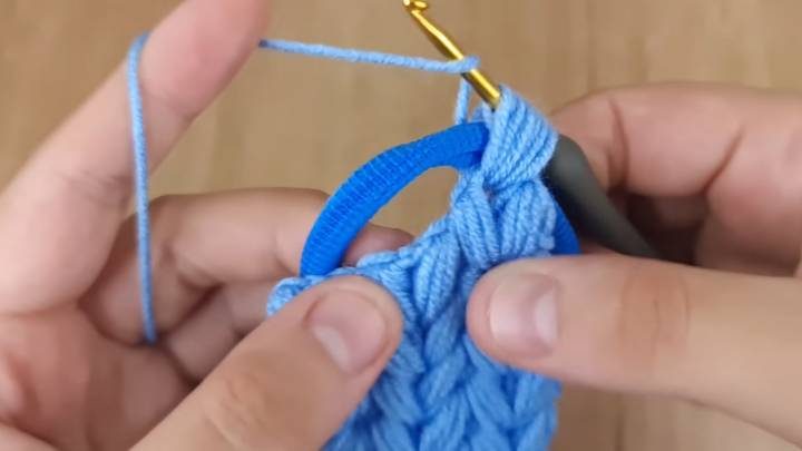 Теперь через каждые 3 накида вяжите крючком назад. Продевайте крючок через 3 накида, делайте воздушную петлю, снова 3 накида — снова воздушная петля, и так до конца.