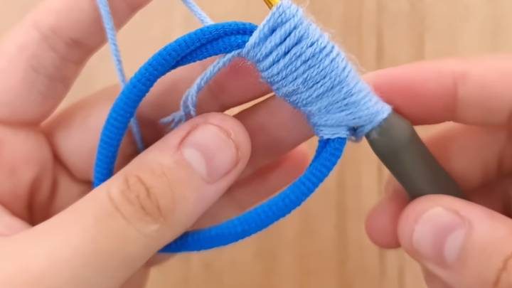 Очень оригинальное вязание крючком, которое нетрудно повторить! Вам понадобится только пряжа и резинка в тон.