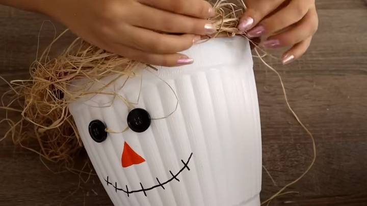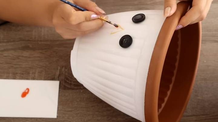 Третий горшок покрасьте, приклейте пуговицы-глаза. Нарисуйте нос и рот пугалу.