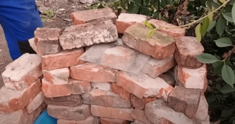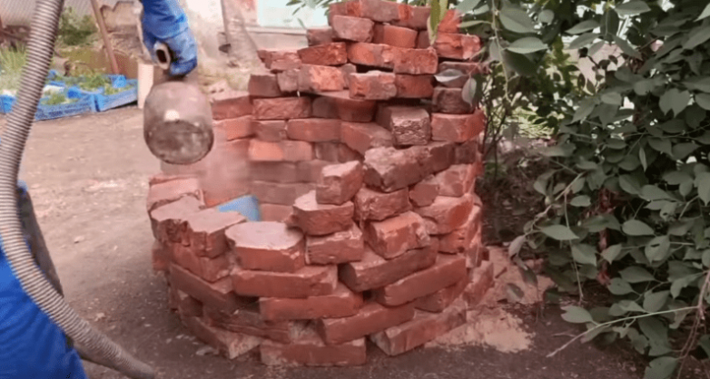 Затем берем кирпичи и обкладываем ими таз, собирая стенку желаемой высоты и формы. Вместо кирпича можно также использовать и камни или создать корпус фонтана при помощи цемента.