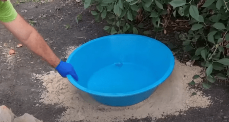 Для начала нужно подготовить основу фонтана. Для этого можно использовать обыкновенный таз: выбираем место, разравниваем землю и устанавливаем таз.