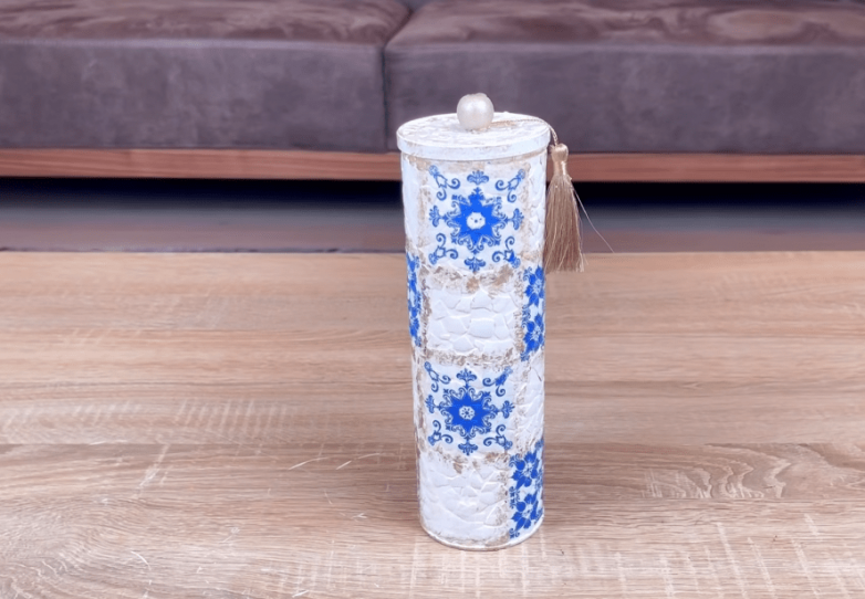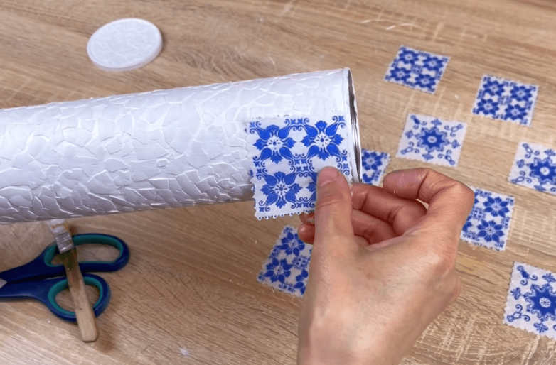 Берем узорчатую салфетку и отсоединяем от нее слой с рисунком. Вырезаем понравившиеся фрагменты. В нашем случае это равные по величине квадраты с орнаментом. Предварительно промазав рабочую поверхность клеем, аккуратно приклеиваем квадраты к тубе, одновременно расправляя. Сверху покрываем салфетку еще одним слоем клея. Квадраты размещаем в шахматном порядке. Работу начинаем с верхней части тубы.