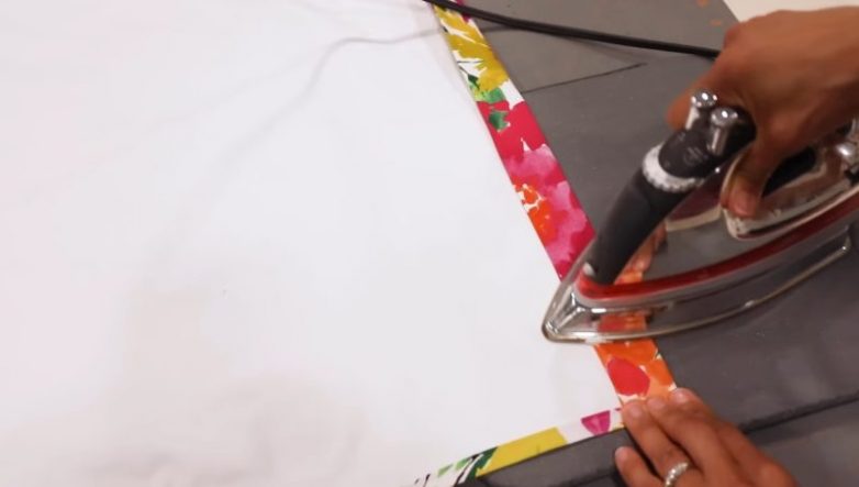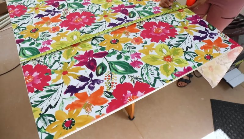 Для работы понадобится отрез ткани blackout, фиксирующий клеевой спрей, двусторонний скотч, яркая ткань, держатель для штор, утяжелитель и крепления на окна. Из blackout ткани выкроите деталь, размер которой соответствует размеру окна. Из цветной ткани выкроите полотнище на 6 см шире, чем ткань blackout.