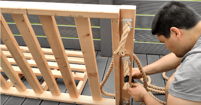 Качели будут подвешиваться на канаты, для них подготавливаем крепление — бруски с симметричными отверстиями, по диаметру равные диаметру каната. Крепления с отверстиями фиксируем по краям каркаса. На этом этапе при желании каркас можно покрыть лаком или краской, а также пропитать специальным составом для дерева.