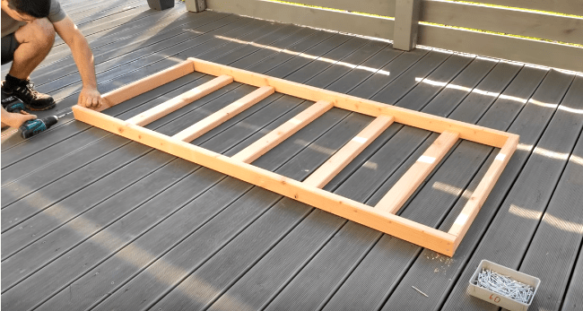 В первую очередь вам необходимо собрать каркас сидения. Для этого подготавливаем деревянные бруски нужного размера и собираем их в прямоугольную рамку.