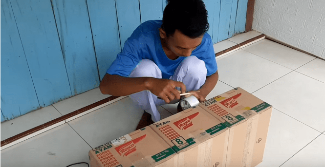 Затем при помощи горячего клея собираем коробки в полку желаемой высоты, стыки коробок также проклеиваем скотчем — так мы не только укрепим конструкцию, но и замаскируем швы.