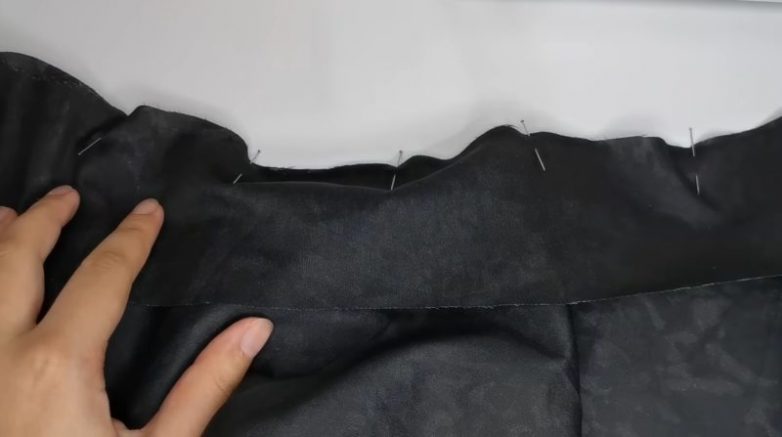 Сострочите две детали в один длинный пояс. Сколите пояс с верхним краем юбки, и сострочите детали.