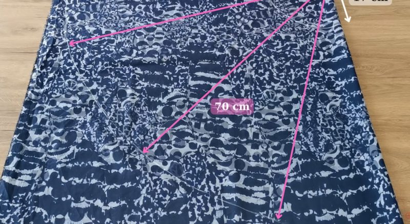 Квадратный отрез ткани размером 150 см на 150 см сложите вчетверо. От угла отложите две окружности: первую диаметром 17 см, вторую диаметром 70 см. Вырежьте ткань по намеченным линиям.