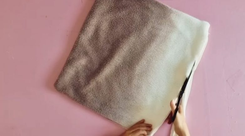 Подберите красивую подкладочную ткань, чтобы сделать сумку двусторонней. Удалите наполнитель из старой диванной подушки. Разрежьте по линии швов.
