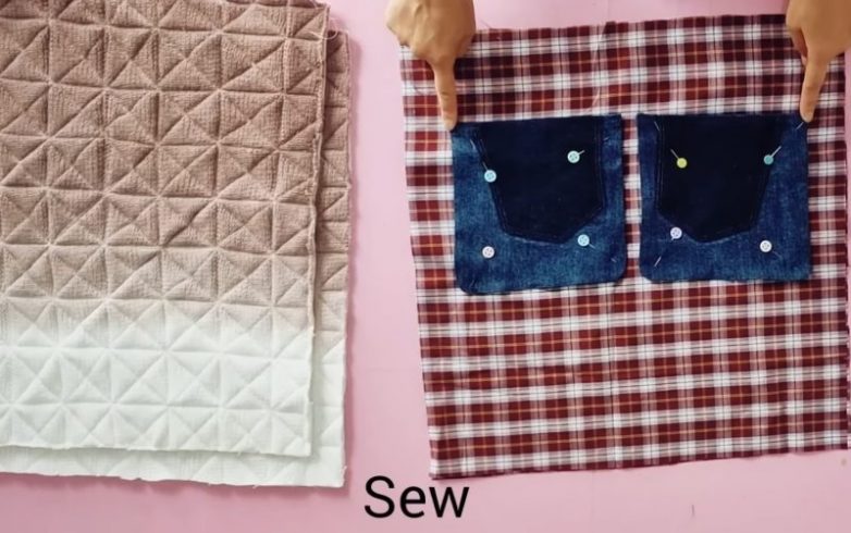 Для дальнейшей работы понадобятся 2 лоскута отделочной ткани размером 40 см на 40 см, 2 готовых кармана размером 16 см на 16 см (карманы можно срезать у старых джинсов) и цепочка с карабинами для изготовления ручки.