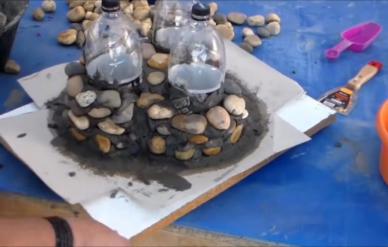 Далее у бутылок обрезаем дно и устанавливаем их на подготовленное на предыдущем этапе основание. Для дальнейшей работы рекомендуется покрыть бутылки любым маслом — так вы точно беспрепятственно в конце сможете вынуть их из застывшей формы.