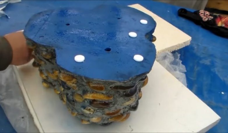Даем цементу немного закрепиться, чтобы он держал форму, а затем вынимаем из заготовки бутылки. После полного высыхания раствора, при необходимости зашлифовываем поверхность.