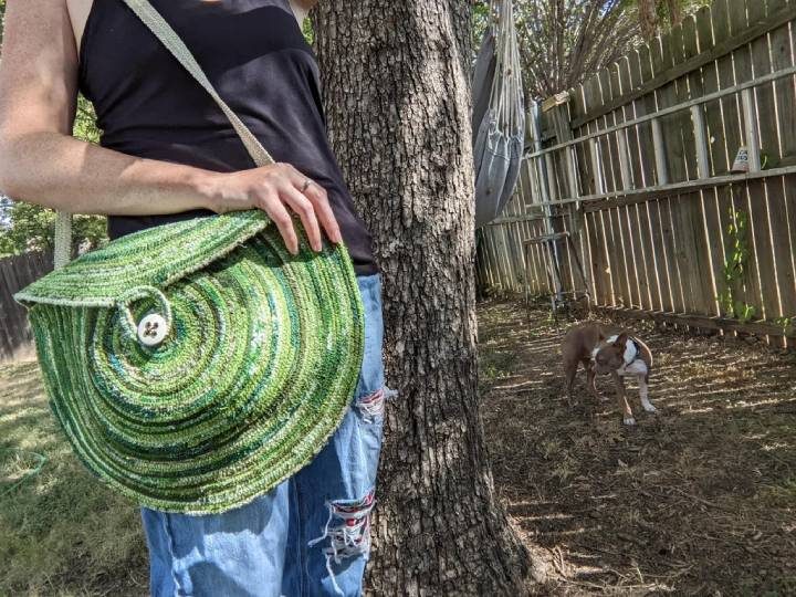 Теперь необрезанная часть будет закрываться поверх обрезанной и застегиваться петелькой к пуговице. Очень простая и оригинальная сумочка!