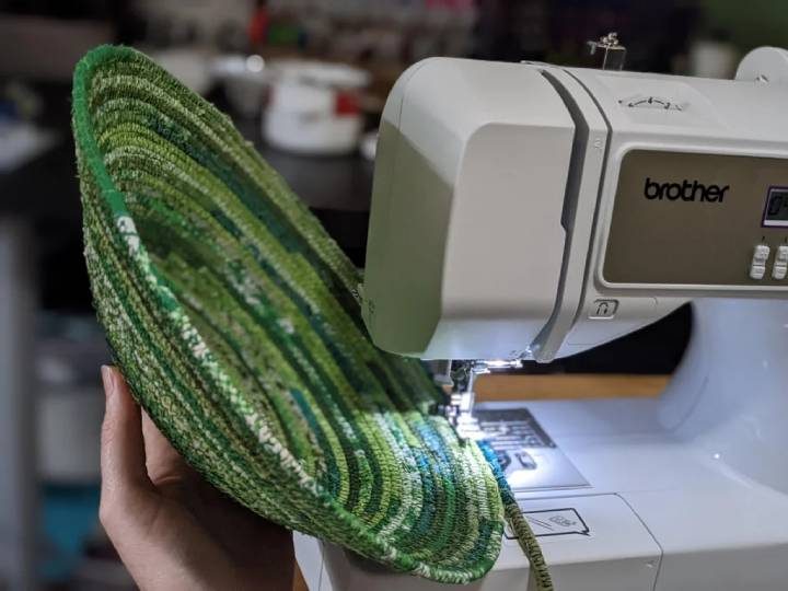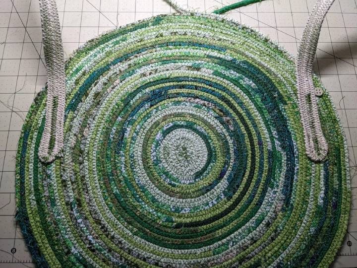 Когда достаточная длина верёвки будет обернута полосками ткани, сверните её в улитку и прошейте.