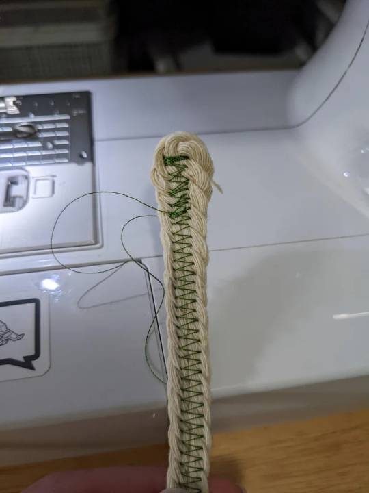 Продолжая оборачивать, прошивайте на машинке, чтобы зафиксировать ткань на верёвке.