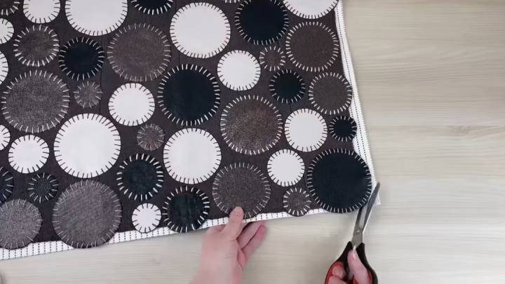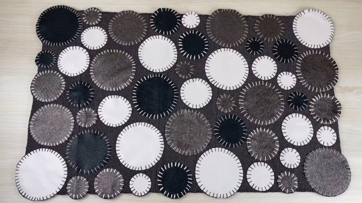 Подберите плотную ткань 80*50 см. Вручную, аккуратно, контрастными нитками пришейте кожаные круги к ткани.