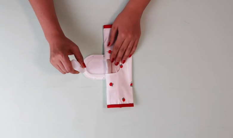 Из меньшей детали сделайте прямую бейку, загладив ее сначала пополам, а затем каждую из сторон к центру. Пристрочите, сформировав небольшую ручку.