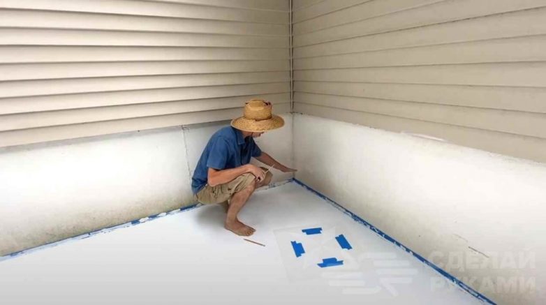 После этого автор красит поверхность площадки в базовый белый цвет. Поскольку зона отдыха прилегает к дому, то стыки основания со стенами нужно проклеить малярной лентой.