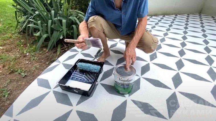 На последнем этапе останется только дождаться, пока высохнет рисунок, потом покрыть всю поверхность акриловым лаком для бетона.