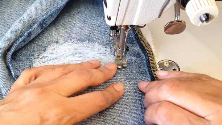 Поскольку просто приклеивание дополнительной укрепляющей ткани недостаточно, то следует сесть за машинку. Подберите нитки точно в тон джинсам и прямо по заплатке прошить.