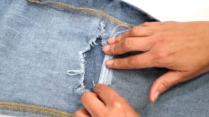 Прежде всего, следует подобрать нитки в тон джинсам. Необязательно абсолютно такого же цвета — но подходящего, сочетающегося с джинсами. Здесь всё исключительно на ваш вкус: кому-то нравится взять несколько оттенков и сочетать их, кому-то — добавить контрастный золотой или серебряный цвет и т.д. Теперь, когда нитки подобраны, следует вывернуть джинсы наизнанку. Аккуратно распороть боковой шов рядом с дыркой. Намотать нитки на руку и перенести на джинсы. Джинсы, по краям дырки, смазать клеем-карандашом, чтобы нитки были немного зафиксированы.