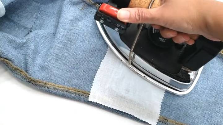 Теперь сверху положите кусочек ткани для заплаток с клеевой стороной. С помощью утюга прикрепите клеевую сторону к ниткам и самим джинсам.